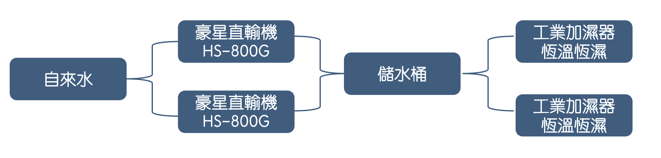 【高流量載體】雙機併聯運作: 同步採用兩台 豪星 HS-800G 直輸型 RO 機。透過併聯技術,造水量加倍,確保在高峰加濕期間仍能提供穩定並不間斷的高純度 RO 水。